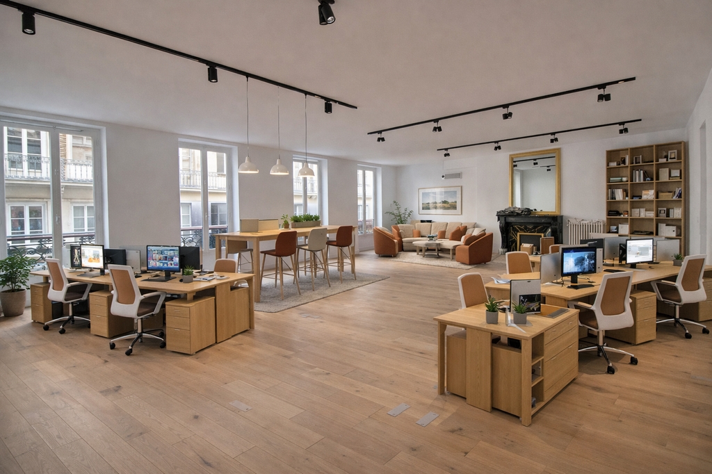 - Surface aménagée en un mixte d'espaces ouverts et bureaux cloisonnés